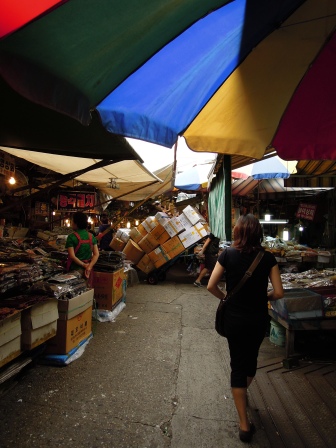 お店の中で大根の皮をたくさん向いてキムチの準備してました。