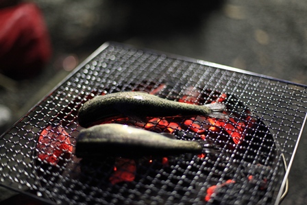 釣ったばかりのニジマスを炭焼きで。