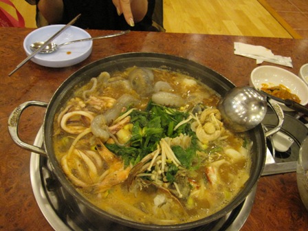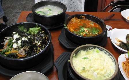 キムチチゲ、韓国風茶碗蒸し、石焼ビビンバ、ソワロンタン(牛スープ)