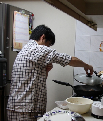 で、カズがハンバーグを焼いてます。